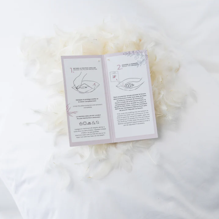 - Garnissage : duvet blanc (550+ Loft) avec un noyau en plumes amovible