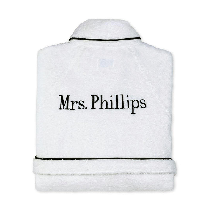 - Couleurs disponibles : Blanc avec passepoils en blanc, rose, noir, vert, bleu et gris fumé. Pour les options de monogramme, veuillez nous contacter au 514-486-2424.